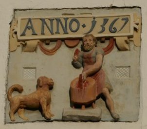 En tenslotte nog een echt heel oude steen. Uit 1567. Het beroep van de bewoner van toen er op afgebeeld.